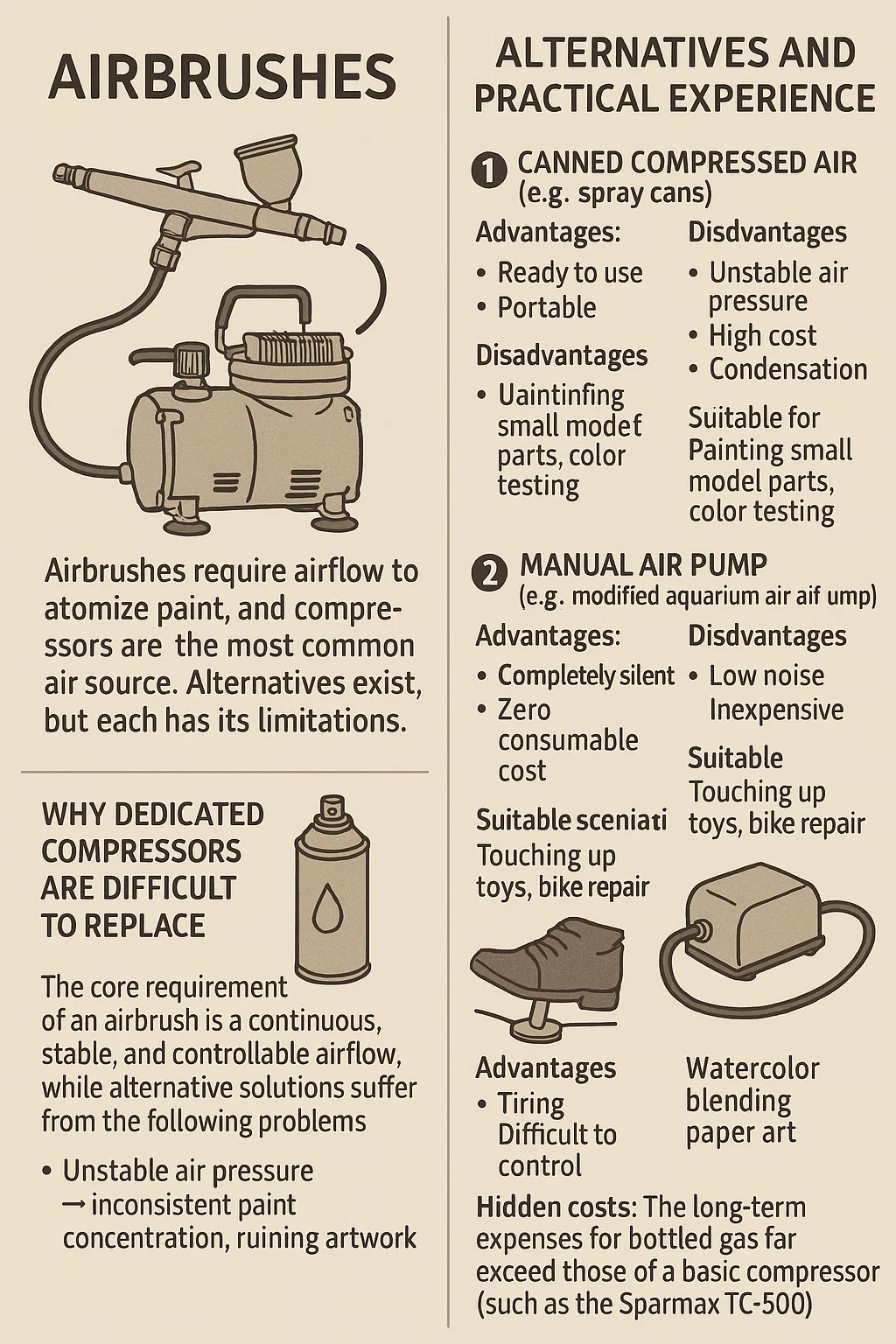 Základním požadavkem airbrush je nepřetržitý, stabilní a ovladatelný proud vzduchu, zatímco alternativní řešení trpí následujícími problémy: