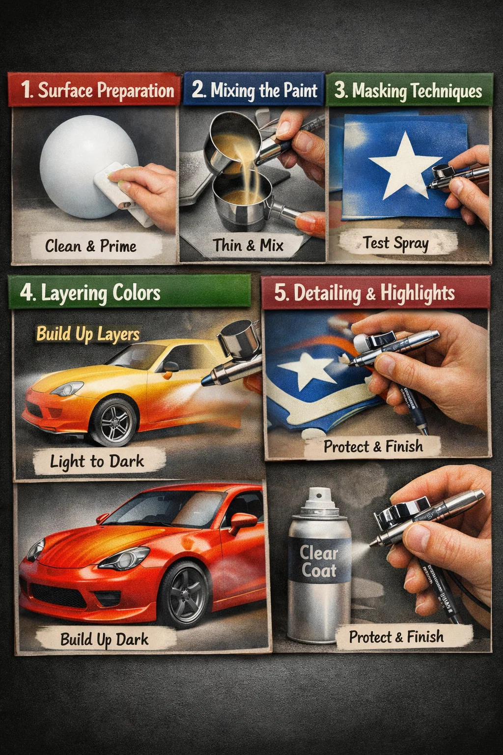 Zde jsou hlavní kroky k dokončení airbrush malování: