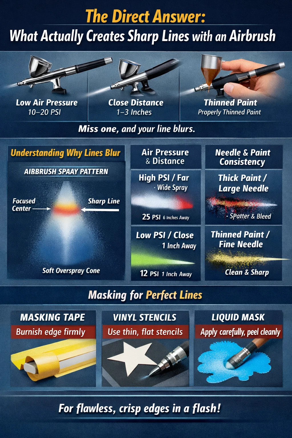 Ostré linie s airbrushem se skládají ze čtyř základních proměnných, které spolupracují: nízký tlak vzduchu (typicky 10–20 PSI) , blízkou pracovní vzdálenost (1–3 palce od povrchu), správně naředěnou barvu a záměrné ovládání spouště. Vynechte ani jednu z nich a vaše linie změkne, krvácí nebo stříká. Většina začátečníků bojuje, protože pracují příliš daleko od povrchu a používají příliš velký tlak – dva návyky, které okamžitě zabíjejí přesnost.
